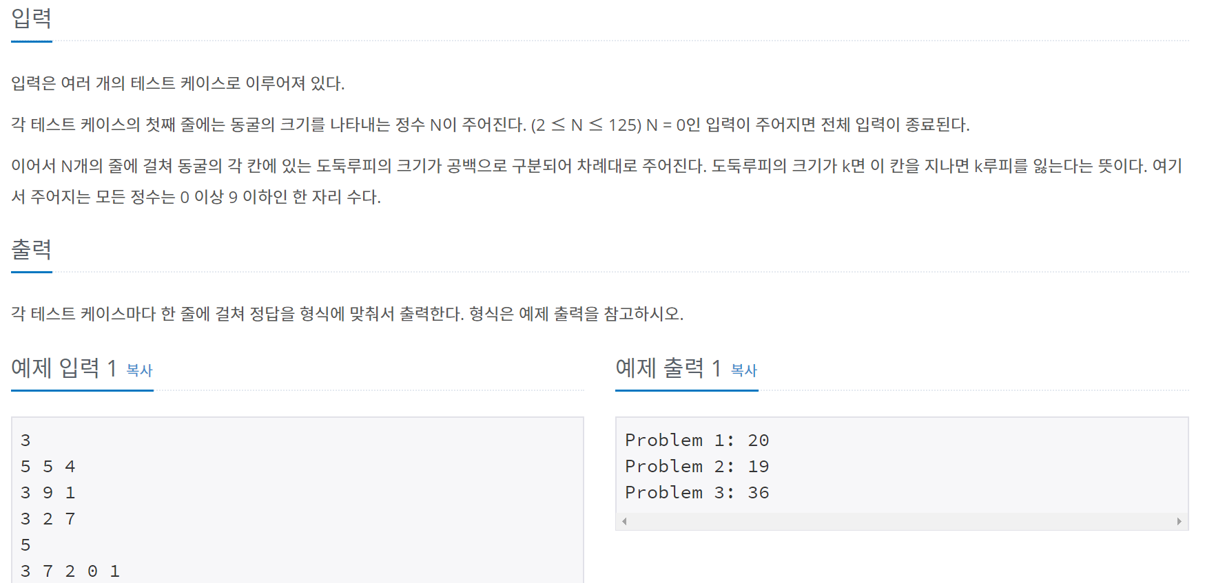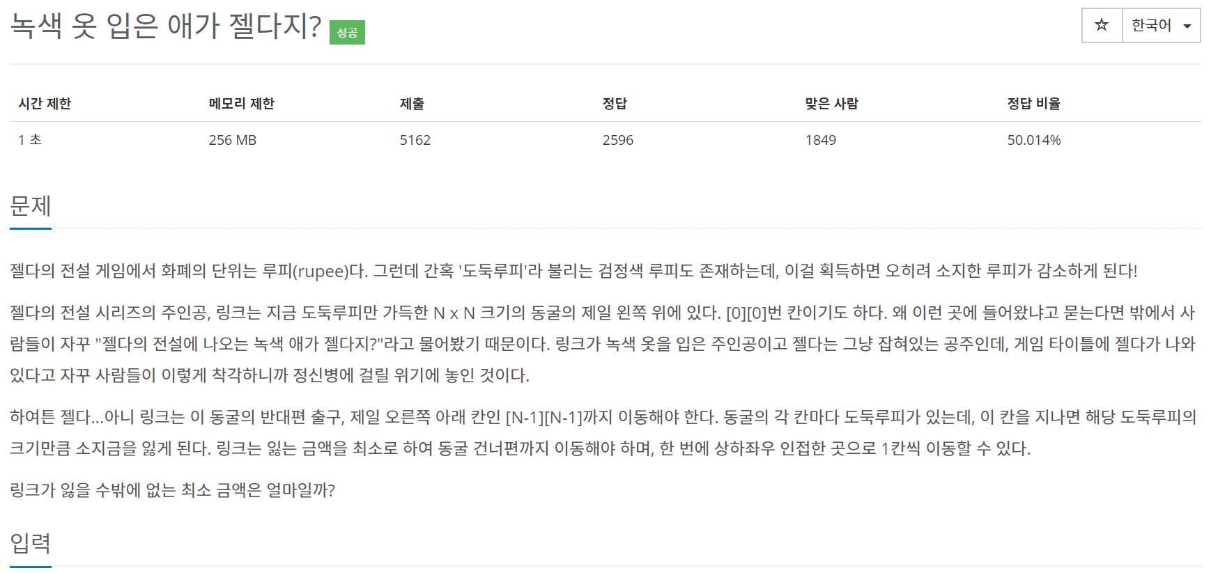 문제 젤다의 전설 게임에서 화폐의 단위는 루피(rupee)다. 그런데 간혹 '도둑루피'라 불리는 검정색 루피도 존재하는데, 이걸 획득하면 오히려 소지한 루피가 감소하게 된다! 젤다의 전설 시리즈의 주인공, 링크는 지금 도둑루피만 가득한 N x N 크기의 동굴의 제일 왼쪽 위에 있다. [0][0]번 칸이기도 하다. 왜 이런 곳에 들어왔냐고 묻는다면 밖에서 사람들이 자꾸 "젤다의 전설에 나오는 녹색 애가 젤다지?"라고 물어봤기 때문이다. 링크가 녹색 옷을 입