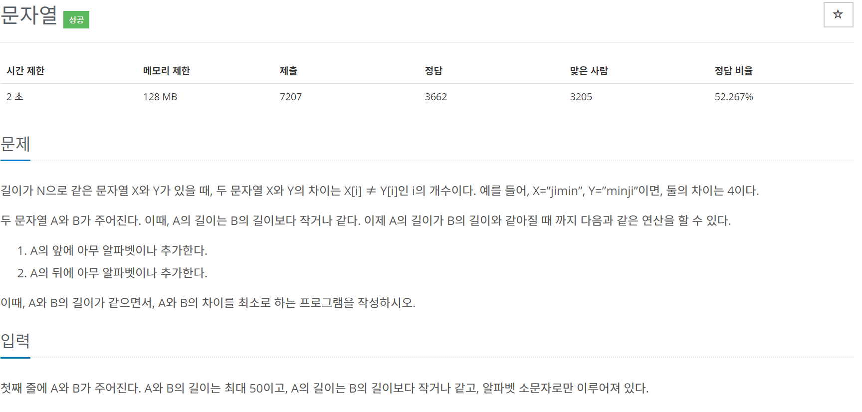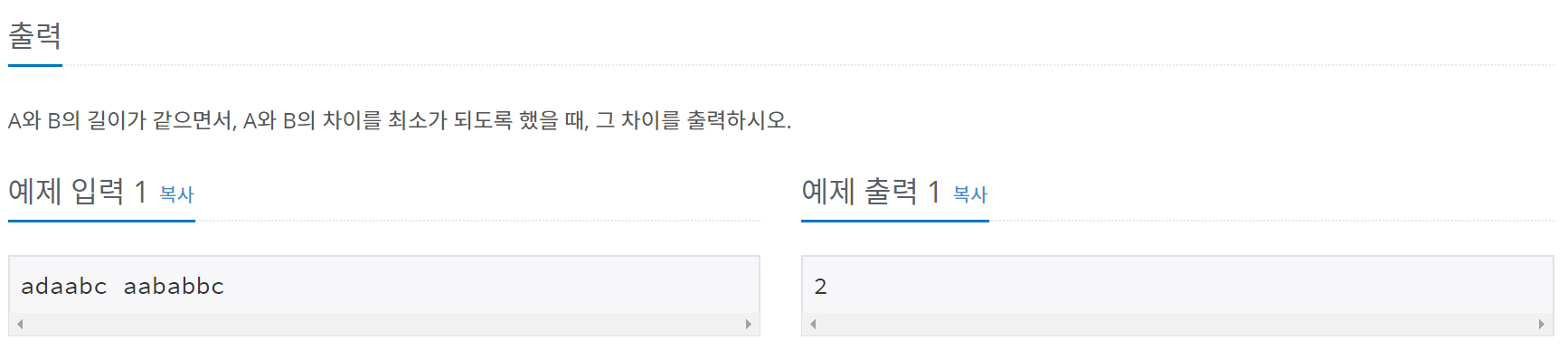 길이가 N으로 같은 문자열 X와 Y가 있을 때, 두 문자열 X와 Y의 차이는 X[i] ≠ Y[i]인 i의 개수이다. 예를 들어, X=”jimin”, Y=”minji”이면, 둘의 차이는 4이다. 두 문자열 A와 B가 주어진다. 이때, A의 길이는 B의 길이보다 작거나 같다. 이제 A의 길이가 B의 길이와 같아질 때 까지 다음과 같은 연산을 할 수 있다. A의 앞에 아무 알파벳이나 추가한다. A의 뒤에 아무 알파벳이나 추가한다. 이때, A와 B의 길이가 같으
