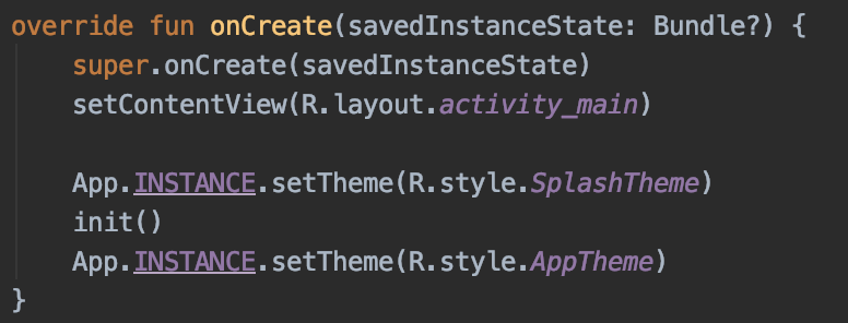 - MainActivity 의 onCreate 함수 내에 application(또는 context).setTheme() 를 통해 위에서 만든 스플래시 테마 적용