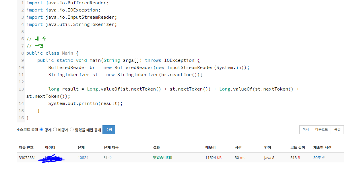 (JAVA) 백준 10824 : 네 수 --- [구현] 본문
