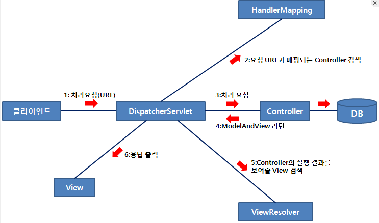 2) DispatcherServlet에서 이러한 요청을 먼저 받아 적절한 Controller에 처리를 요청합니다.