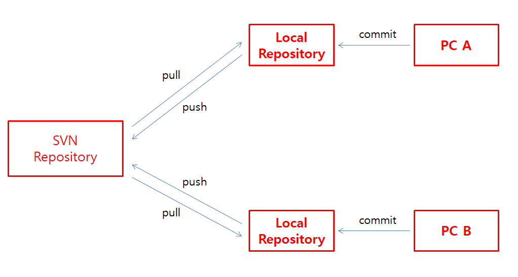 - 단점 : 중앙 SVN서버가 망가지면 전부 잘못됨. 하나의 파일서버에 모든 PC가 직접 소스코드에 접근하기 때문에 충돌 확률이 높음