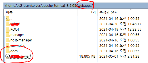 1) war 파일을 tomcat 설치 폴더의 webapps 폴더 내부로 옮기기