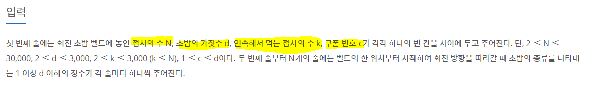 첫 번째 줄에는 회전 초밥 벨트에 놓인 접시의 수 N, 초밥의 가짓수 d, 연속해서 먹는 접시의 수 k, 쿠폰 번호 c가 각각 하나의 빈 칸을 사이에 두고 주어진다. 단, 2 ≤ N ≤ 30,000, 2 ≤ d ≤ 3,000, 2 ≤