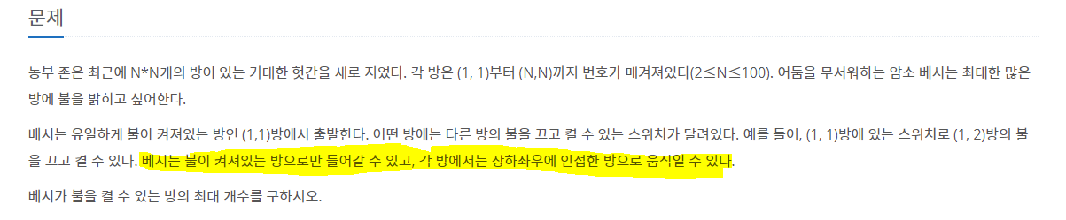 각 방에서 상하좌우로 이동이 가능한데, 중요한 것은 불이 켜져있는 방으로만 들어갈 수 있다는 것.