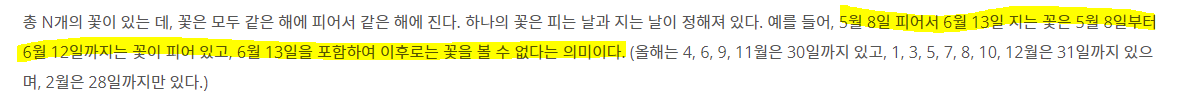 왜냐하면, 입력 값에서 지는 기간을 12월 1일로 받은 경우에는 하루 전인 11월 30일까지 피어있다는 문제 설명이 있기 때문에 헷갈리면 틀립니다.