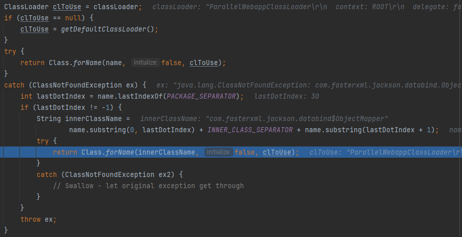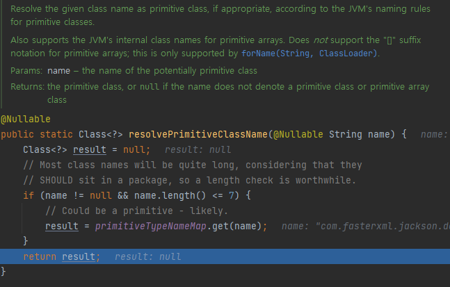 → ClassUtils.isPresent() 함수를 끝까지 타고 가니 위 함수에서 name.length() ≤ 7 때문에 null로 리턴하고,