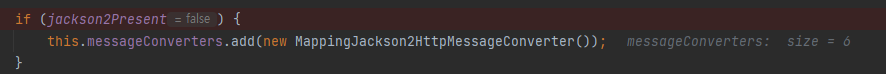 → Spring boot는 jackson2Present boolean 값이 true고, 그렇기 때문에 MappingJackson2HttpMessageConverter 객체를 만들어 집어넣는다.