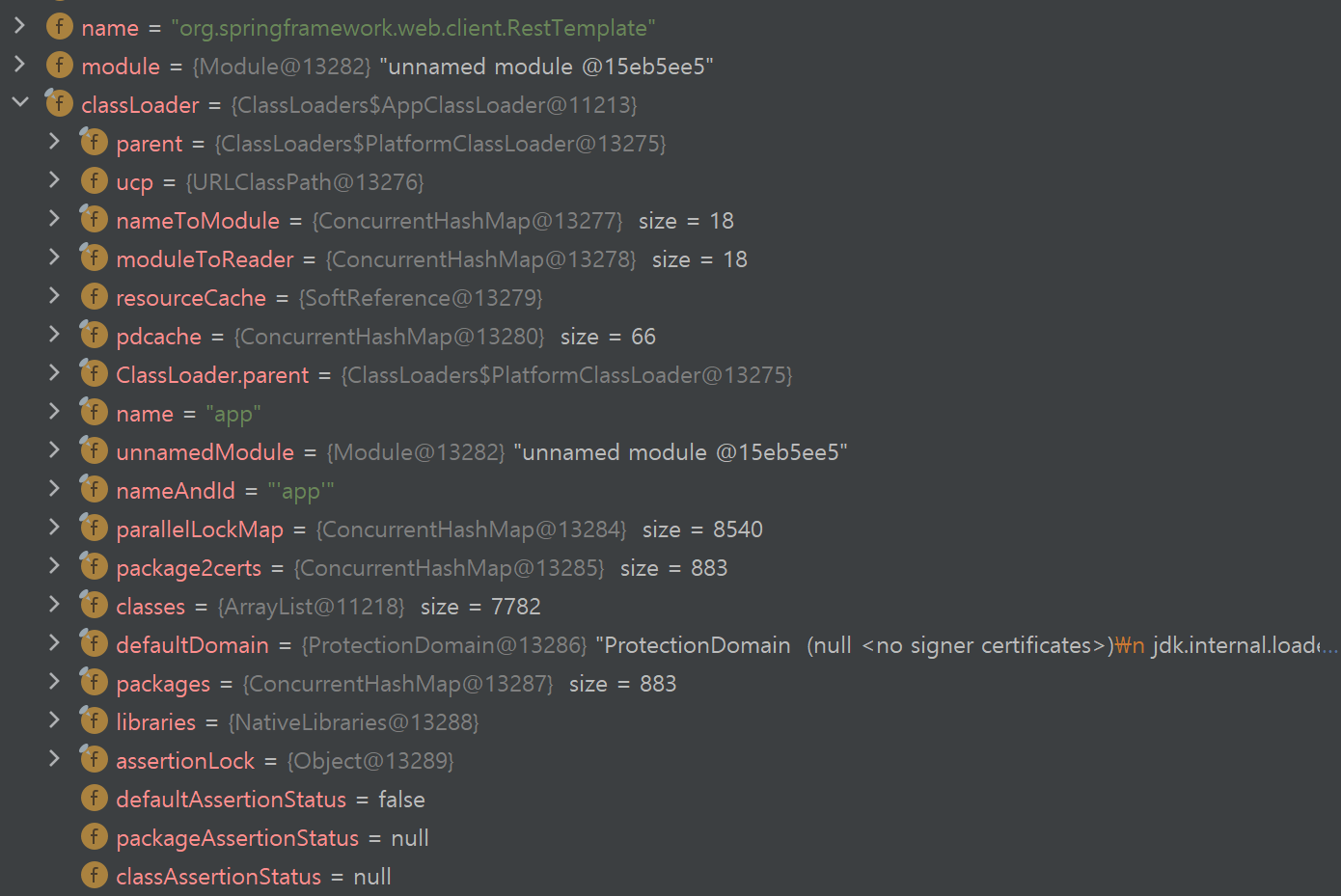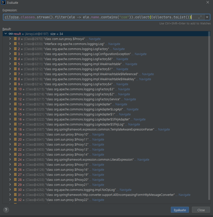 → ClassLoader 안에 담겨있는 Class들 중 "com" 단어가 포함된 이름의 클래스는 위 스크린샷이 전부였습니다.