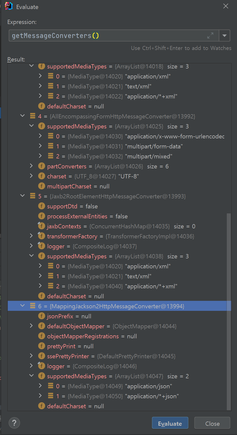 Evaluate를 통해 현재 사용하는 MessageConverter를 확인해보니, Content-Type이 application/json인 경우에 대한 Converter가 없습니다. (RestTemplate : spring-web: 5.2.9 RELEASE)