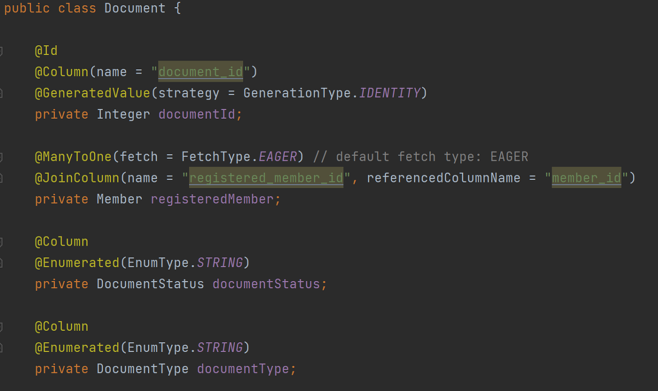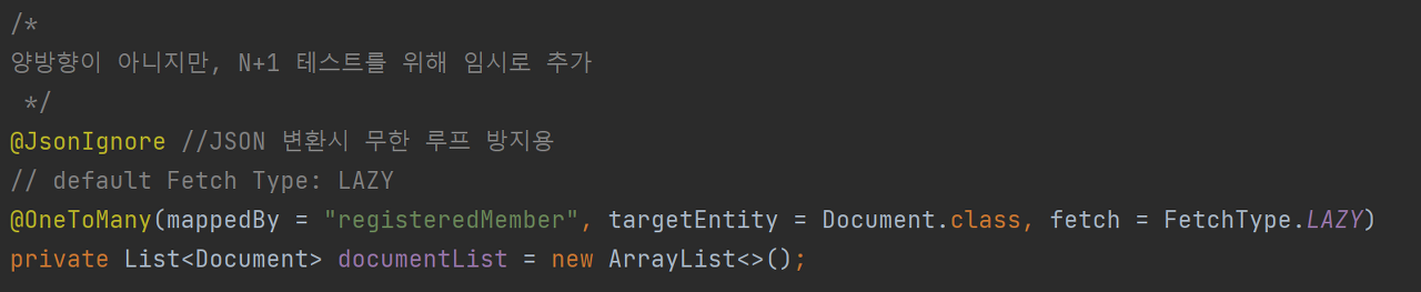 → 단방향 관계이지만, 테스트를 위해 양방향이라고 가정하고 Member Entity에 Document 컬렉션 추가