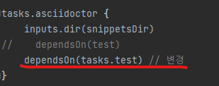 depentsOn(tasks.test) 로 변경해줘야 합니다!