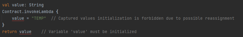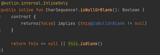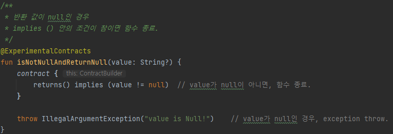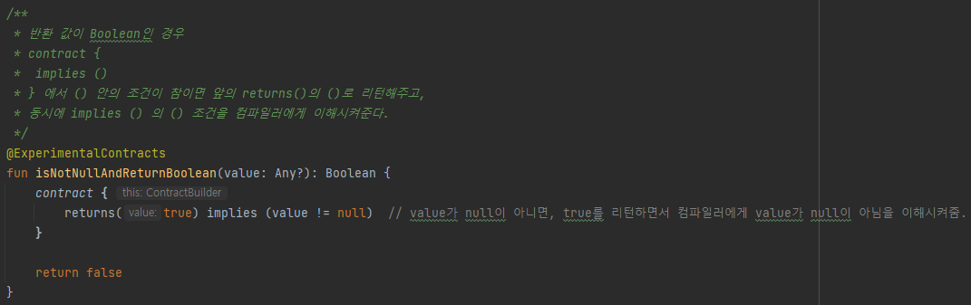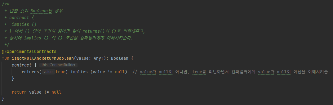 returns(true) implies (value != null) // value가 null이 아니면, true를 리턴하면서 컴파일러에게 value가 null이 아님을 이해시켜줌.