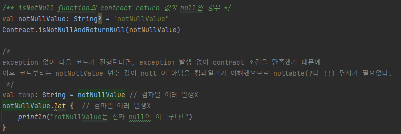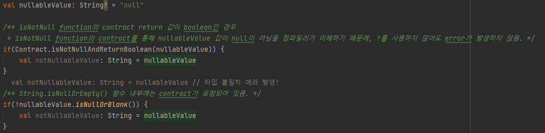 * ex) null check하기 위한 함수에 @ExperimentalContracts와 contract{} 를 통해 null check 하고,