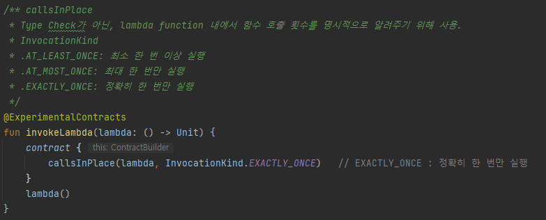 위처럼, @ExperimentalContracts 어노테이션과 contract { } 를 함께 사용하는 것 중 하나로 callsInPlace() 가 있습니다.