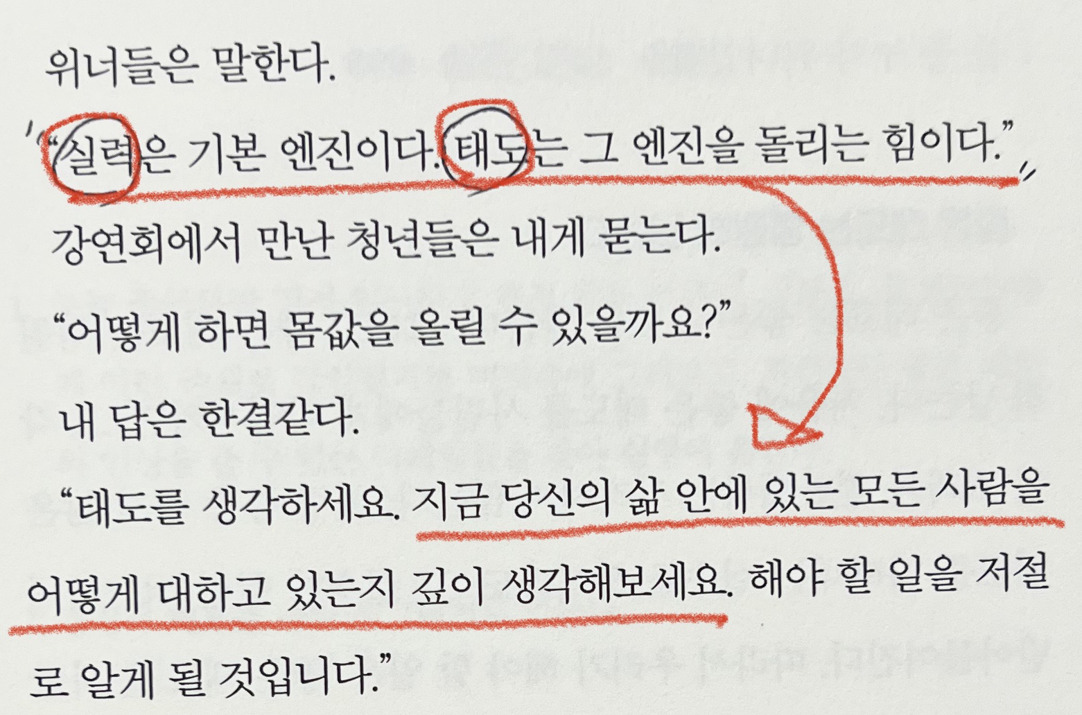 "실력은 기본 엔진이다. 태도는 그 엔진을 돌리는 힘이다."