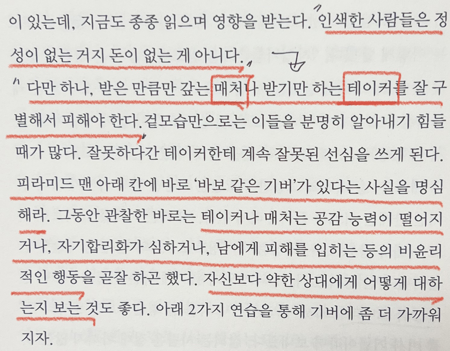 "다만 하나, 받은 만큼만 갚는 매처나 받기만 하는 테이커를 잘 구별해서 피해야 한다."