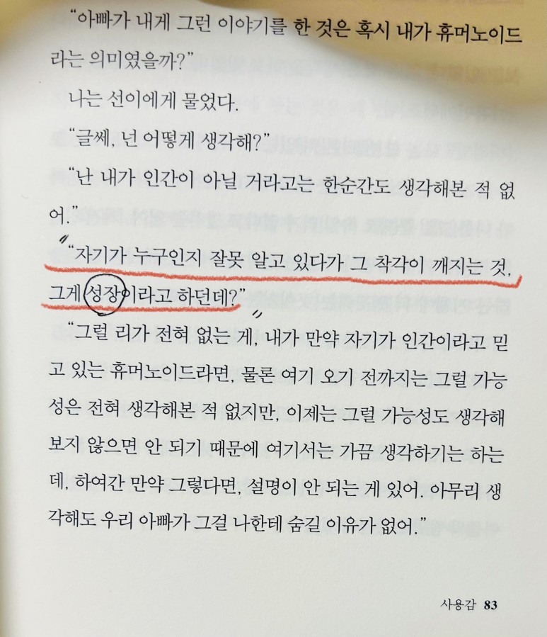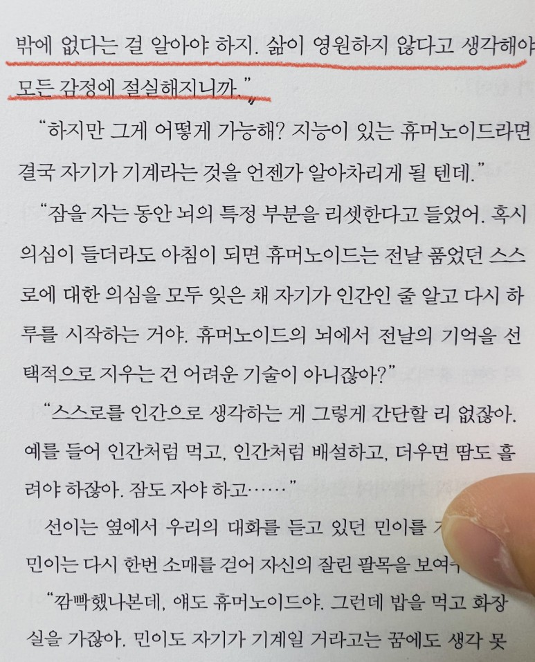 "그러려면 휴머노이드는 인간처럼 아무리 발버둥쳐봐야 언젠가는 죽을 수 밖에 없다는 걸 알아야 하지.