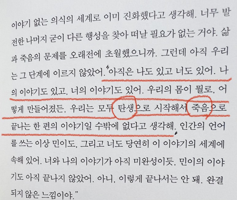 우리의 몸이 뭘로, 어떻게 만들어졌든, 우리는 모두 탄생으로 시작해서 죽음으로 끝나는 한 편의 이야기일 수밖에 없다고 생각해."