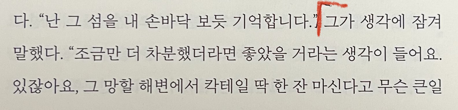 있잖아요, 그 망할 해변에서 칵테일 딱 한 잔 마신다고 무슨 큰일이 나지는 않았을 겁니다.