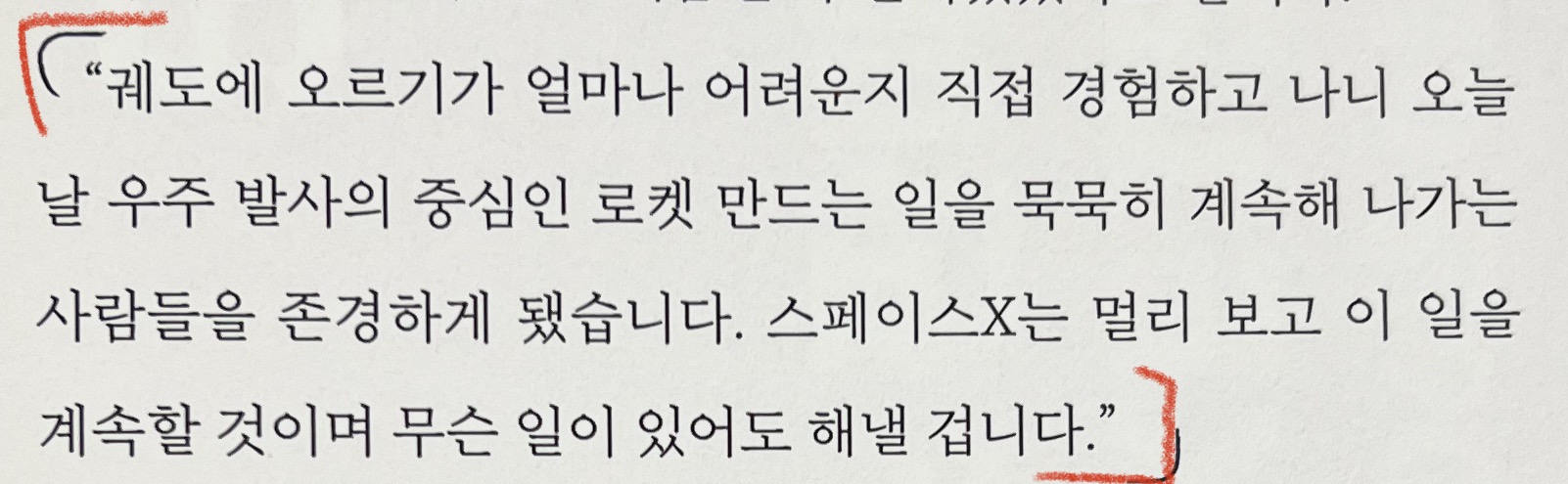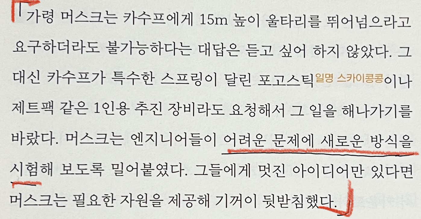 '화성 이주 계획', '재사용 우주선' 이라는 원대한 목표만을 바라보며 실패를 계속 딛고 성공을 쟁취하는 용기와 도전정신.