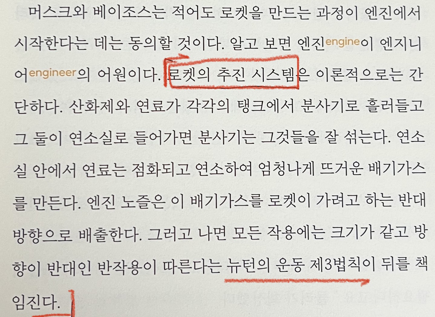 "로켓의 추진 시스템은 ...(중략)... 뉴턴의 운동 제3법칙이 뒤를 책임진다."