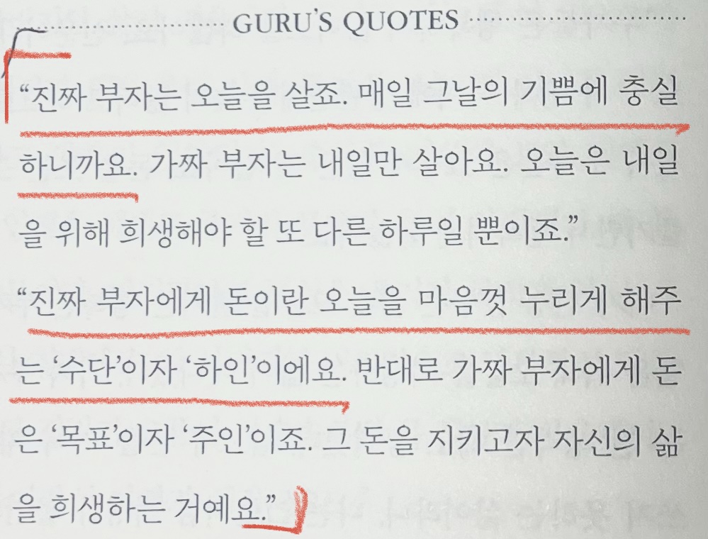 가짜 부자는 내일만 살아요. 오늘은 내일을 위해 희생해야 할 또 다른 하루일 뿐이죠."