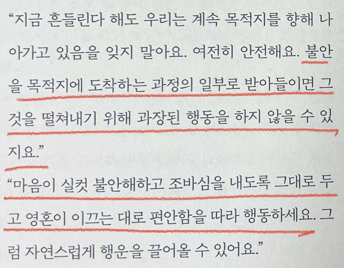 "마음이 실컷 불안해하고 조바심을 내도록 그대로 두고 영혼이 이끄는 대로 편안함을 따라 행동하세요."