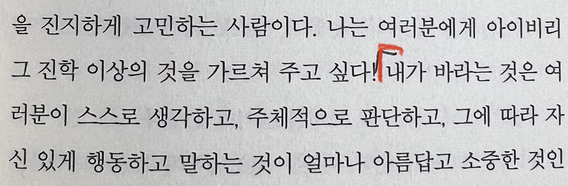 "내가 바라는 것은 여러분이 스스로 생각하고, 주체적으로 판단하고, 그에 따라 자신 있게 행동하고 말하는 것이 얼마나 아름답고 소중한 것인지를 깨닫게 되는 것이다.
