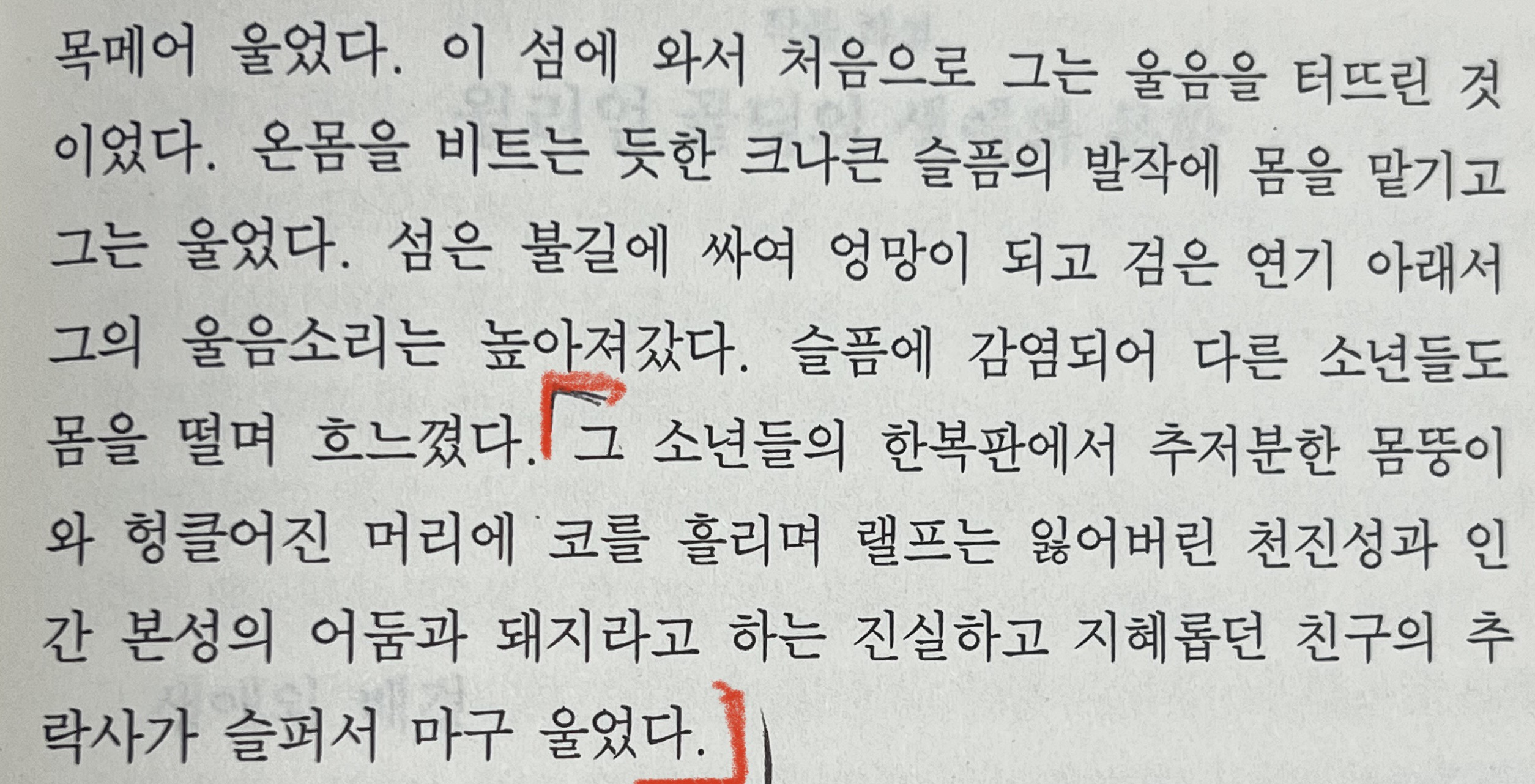 "그 소년들의 한복판에서 추저분한 몸뚱이와 헝클어진 머리에 코를 흘리며 랠프는 잃어버린 천진성과 인간 본성의 어둠과 돼지라고 하는 진실하고 지혜롭던 친구의 추락사가 슬퍼서 마구 울었다."
