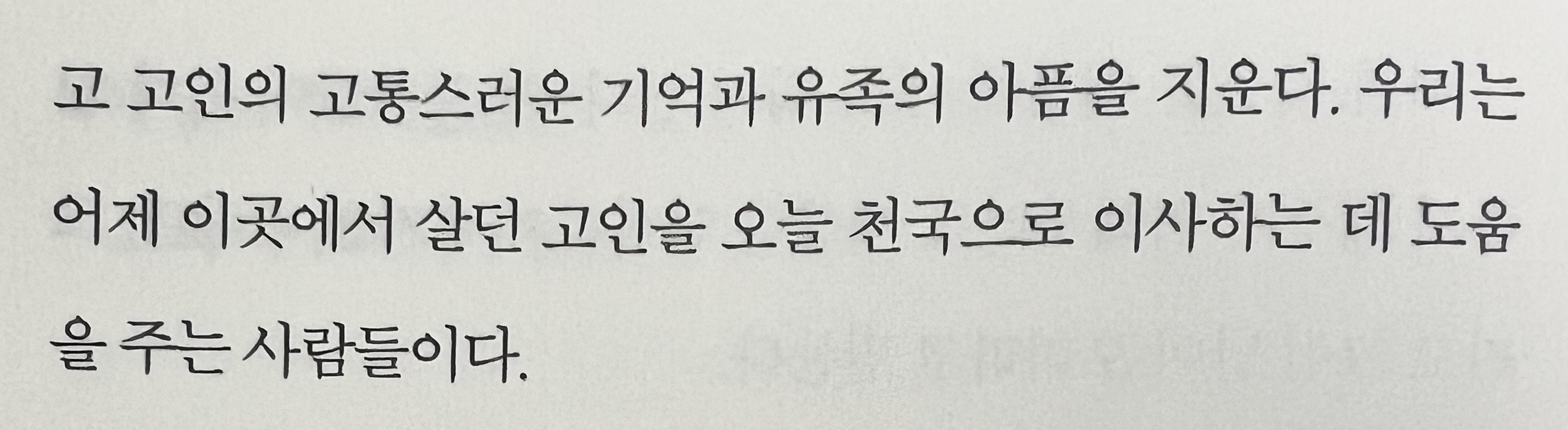 우리는 어제 이곳에서 살던 고인을 오늘 천국으로 이사하는 데