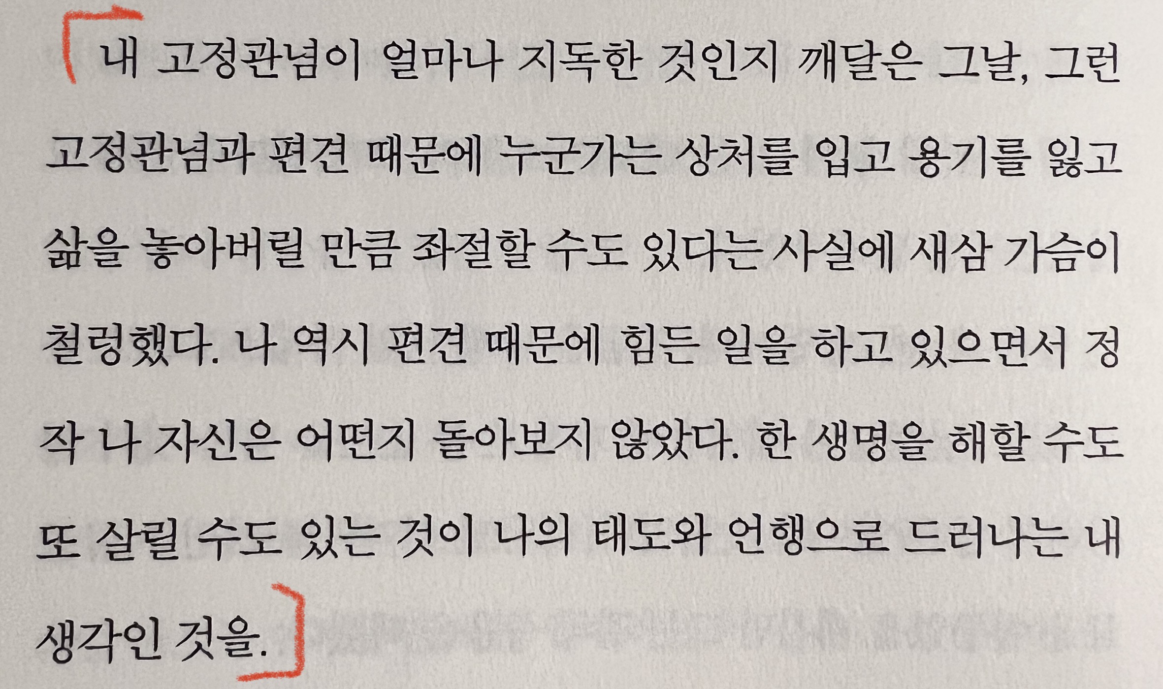 "내 고정관념이 얼마나 지독한 것인지 깨달은 그날, 그런 고정관념과 편견 때문에 누군가는 상처를 입고 용기를 잃고 삶을 놓아버릴 만큼 좌절할 수도 있다는 사실에 새삼 가슴이 철렁했다.