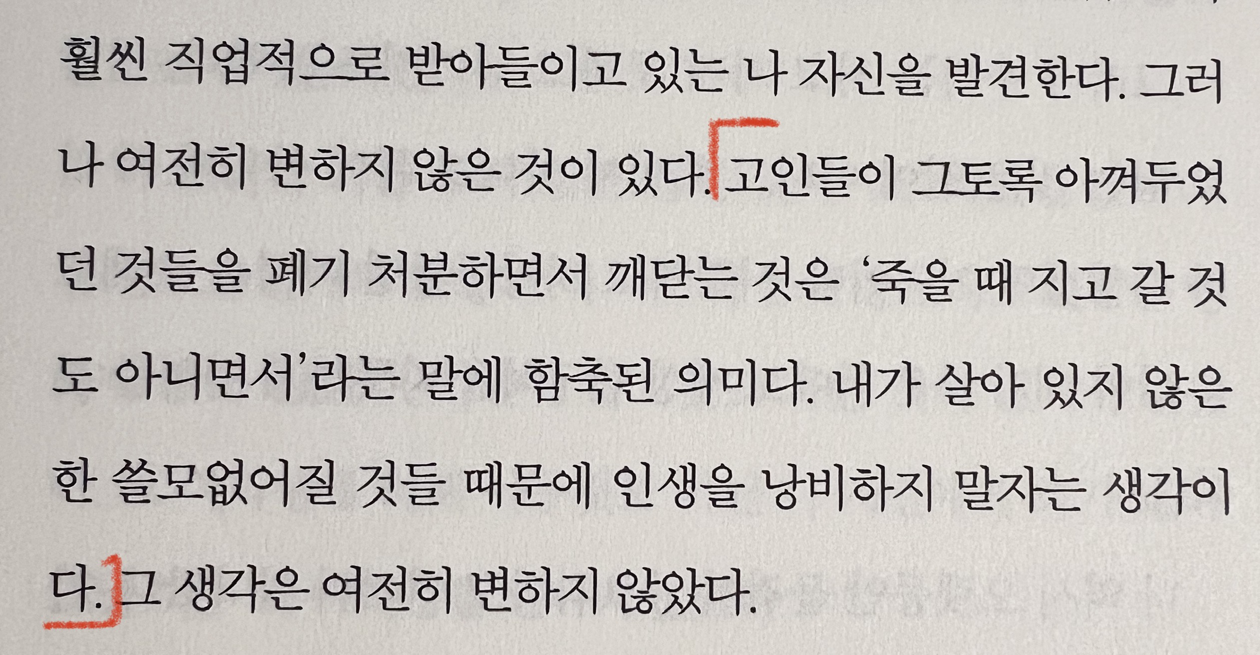 "고인들이 그토록 아껴두었던 것들을 폐기 처분하면서 깨닫는 것은 '죽을 때 지고 갈 것도 아니면서' 라는 말에 함축된 의미다.