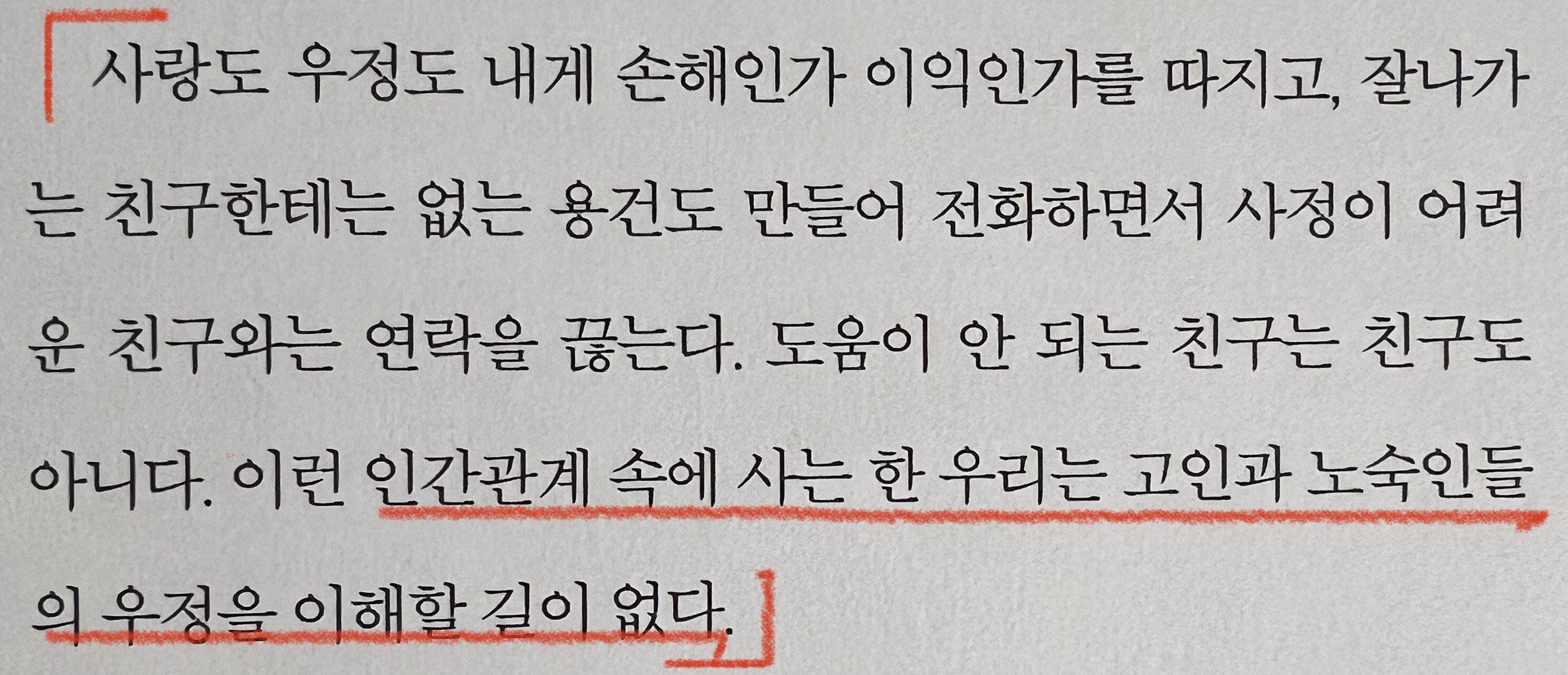 "사랑도 우정도 내게 손해인가 이익인가를 따지고, 잘 나가는 친구한테는 없는 용건도 만들어 전화하면서 사정이 어려운 친구와는 연락을 끊는다.