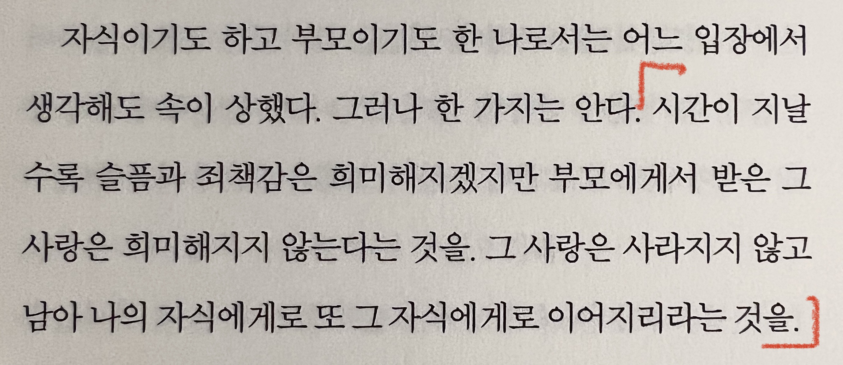 "시간이 지날수록 슬픔과 죄책감은 희미해지겠지만 부모에게서 받은 그 사랑은 희미해지지 않는다는 것을.