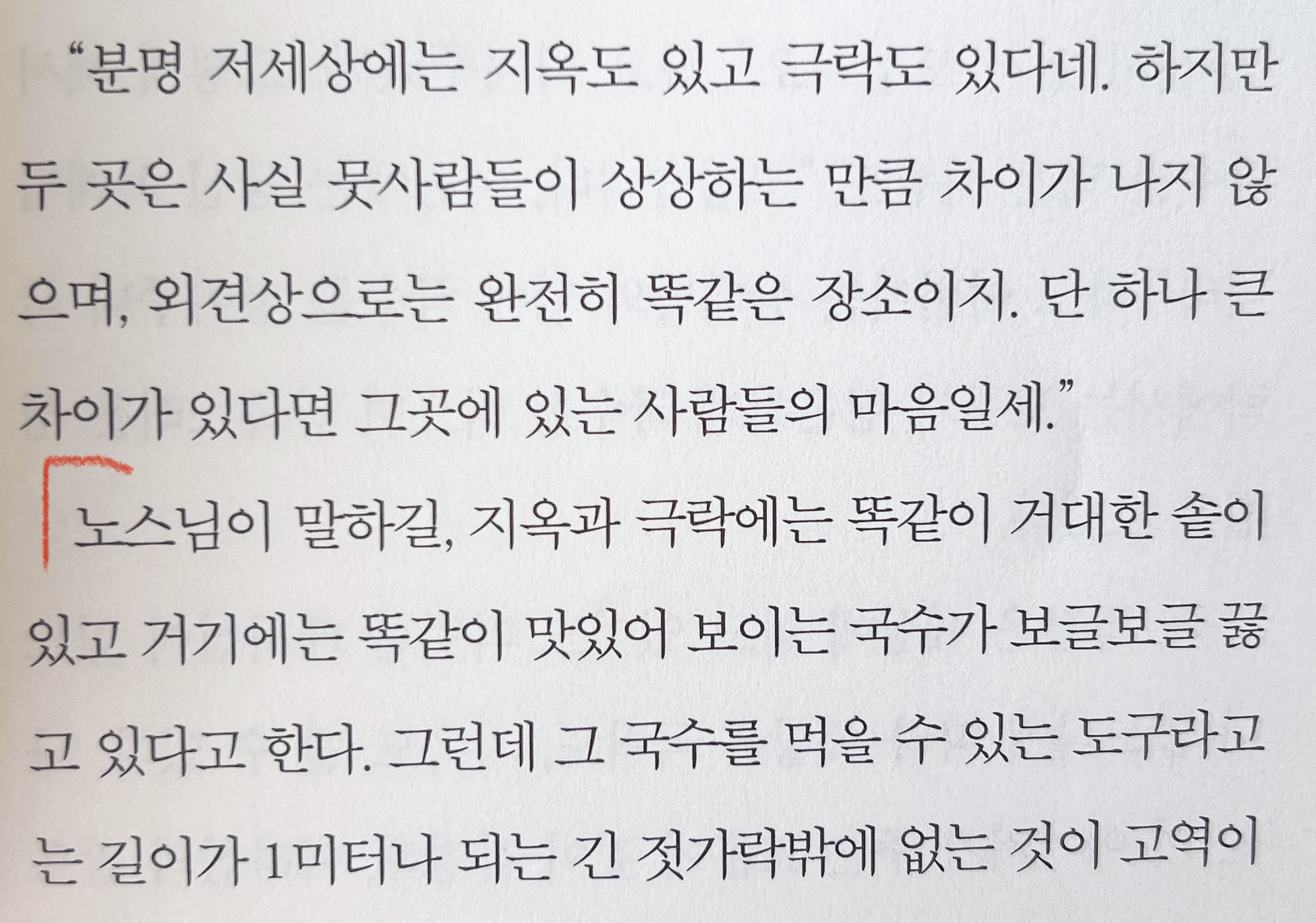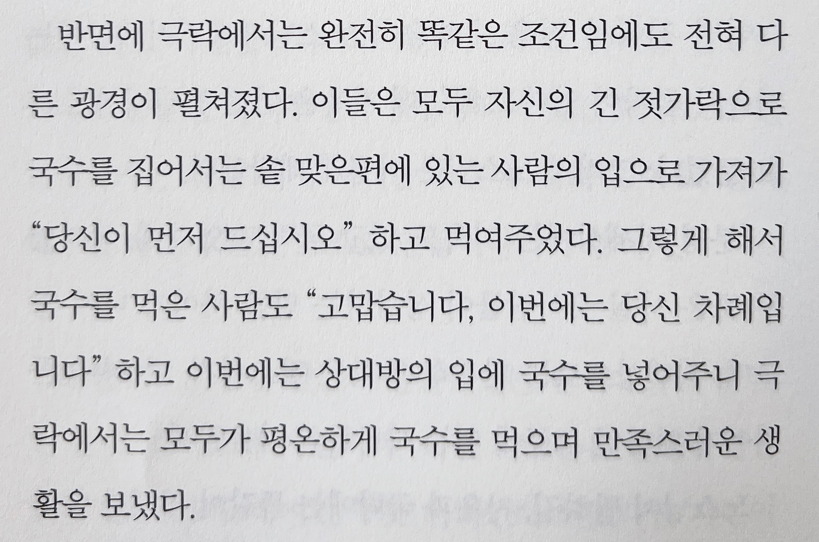 또, 인상 깊고 적절한 비유를 든 이야기가 있어 본문에 담아봤습니다. 바로, 극락(천국)과 지옥의 표현인데요. 종교적인 관점을 떠나 '배려심의 유무' 를 '국수' 에 빗대 두 가지 상반된 상황을 표현한 점이 신선한 충격이었습니다.