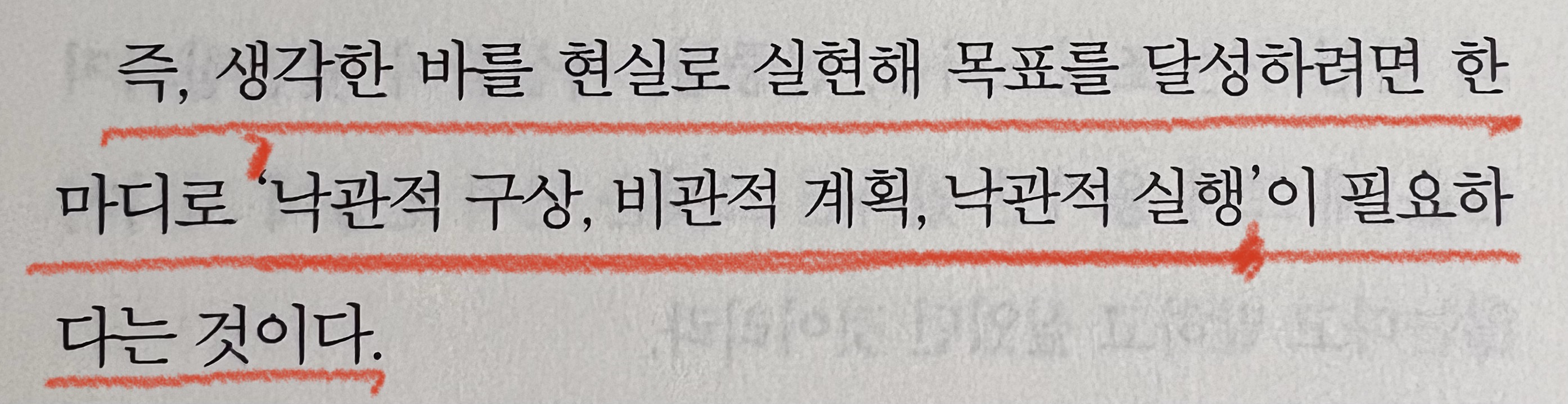 "즉, 생각한 바를 현실로 실현해 목표를 달성하려면 한마디로 '낙관적 구상, 비관적 계획, 낙관적 실행' 이 필요하다는 것이다."