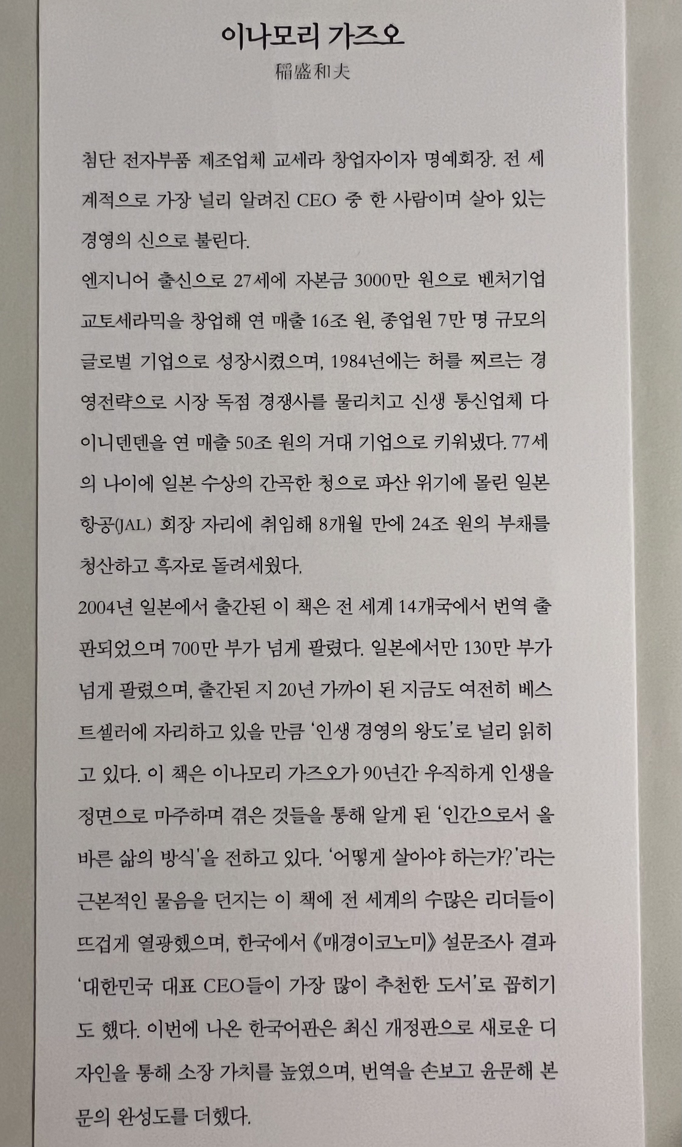 '교세라' 라는 훌륭한 기업을 설립하셨다는 점이 매우 존경스러웠습니다.