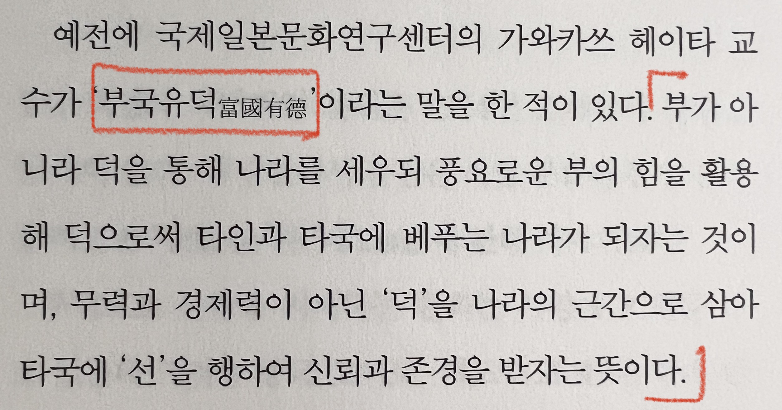 "부가 아니라 덕을 통해 나라를 세우되 풍요로운 부의 힘을 활용해 덕으로써 타인과 타국에 베푸는 나라가 되자는 것이며,