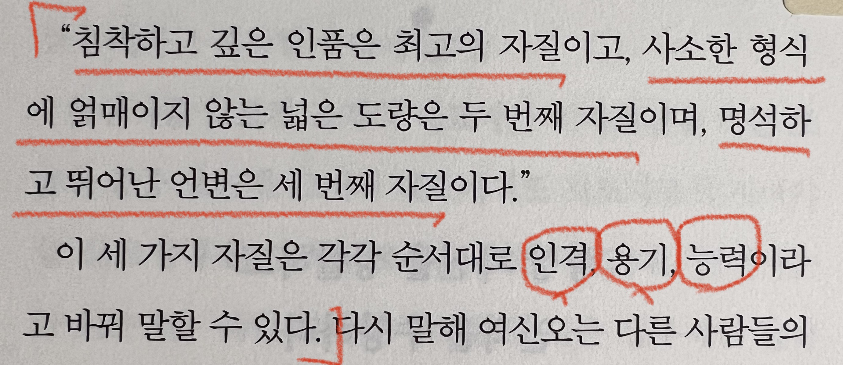 "침착하고 깊은 인품은 최고의 자질이고, 사소한 형식에 얽매이지 않는 넓은 도량은 두 번째 자질이며, 명석하고 뛰어난 언변은 세 번째 자질이다.