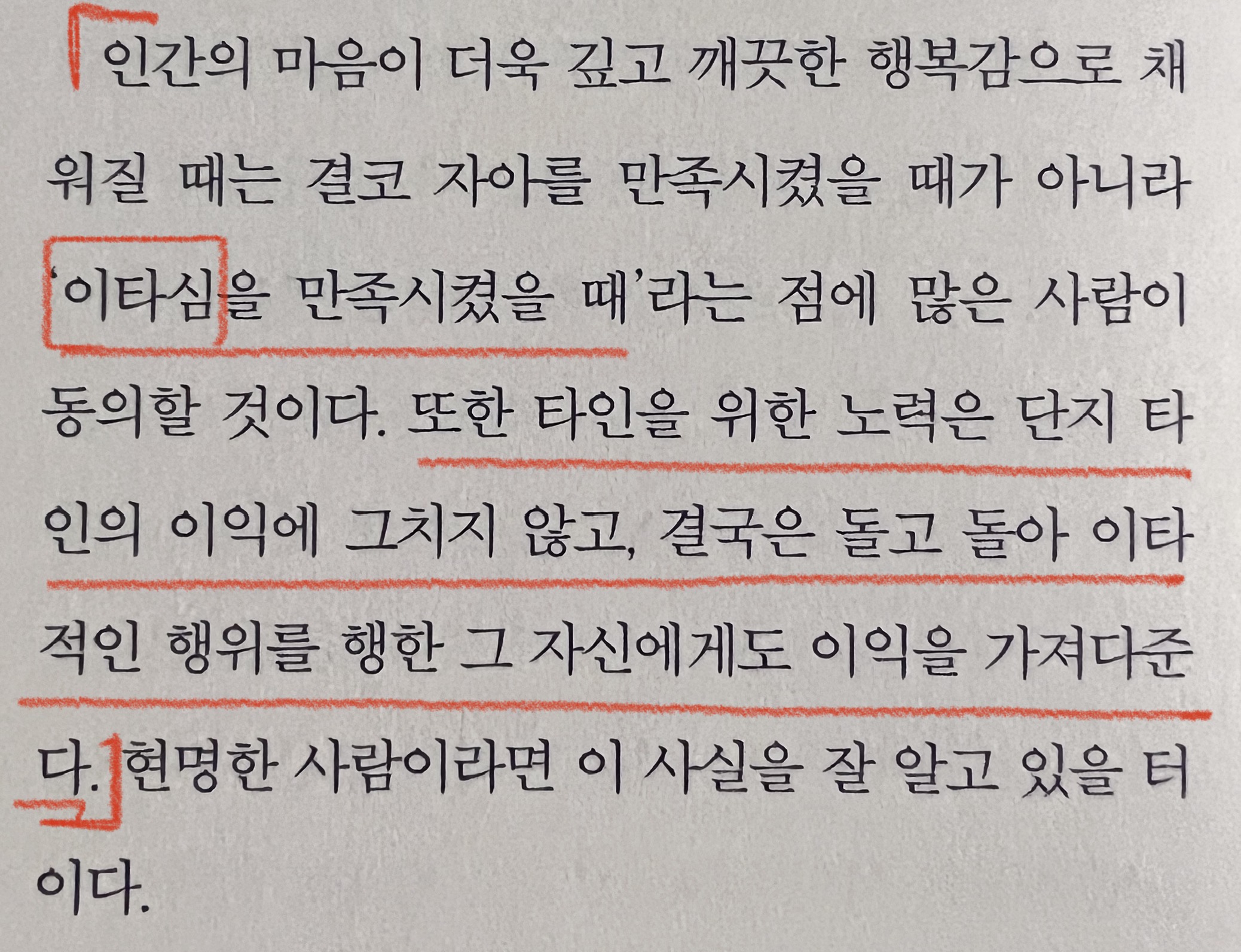 또한 타인을 위한 노력은 단지 타인의 이익에 그치지 않고, 결국은 돌고 돌아 이타적인 행위를 행한 그 자신에게도 이익을 가져다준다."