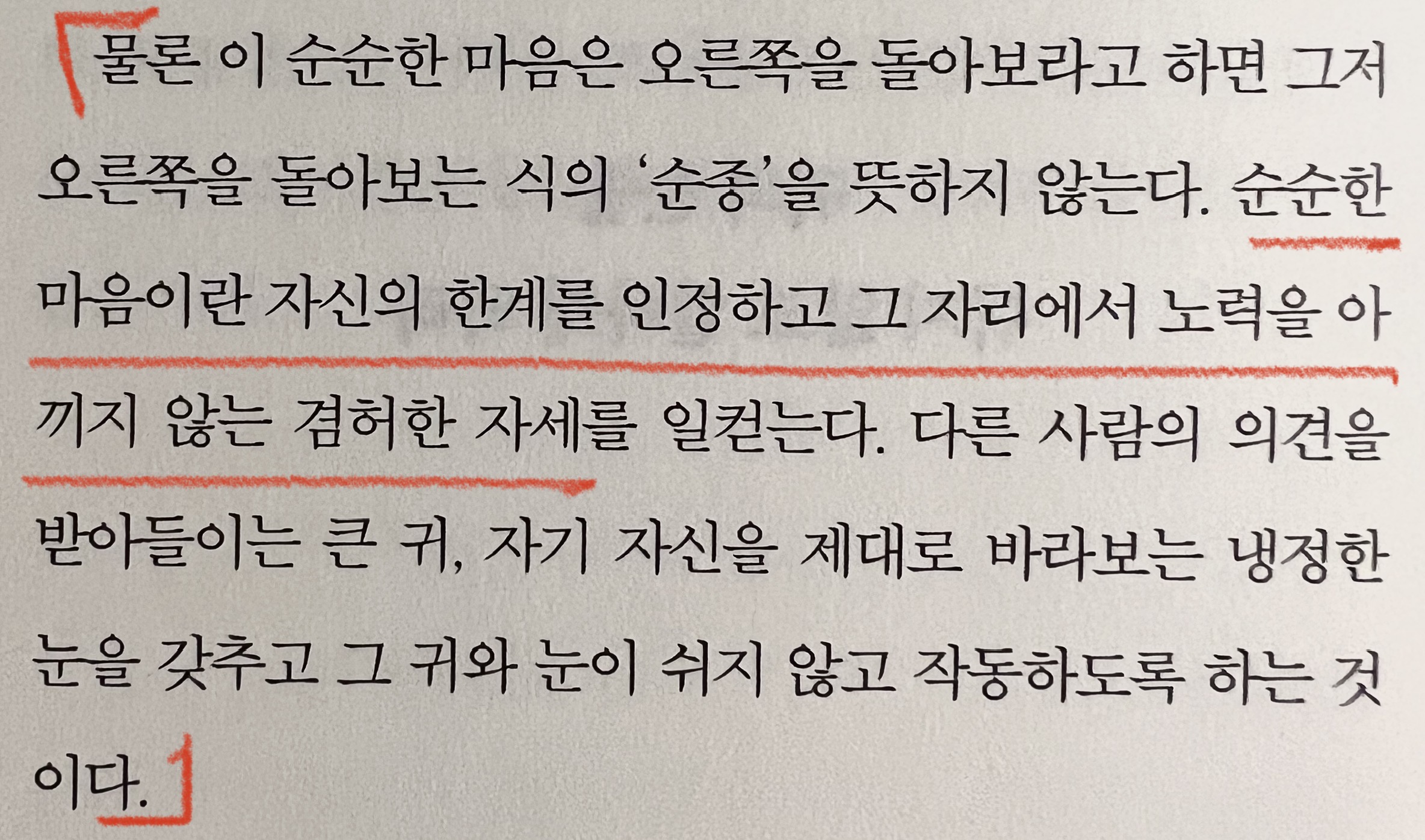 "물론 이 순순한 마음은 오른쪽을 돌아보라고 하면 그저 오른쪽을 돌아보는 식의 '순종' 을 뜻하지 않는다.