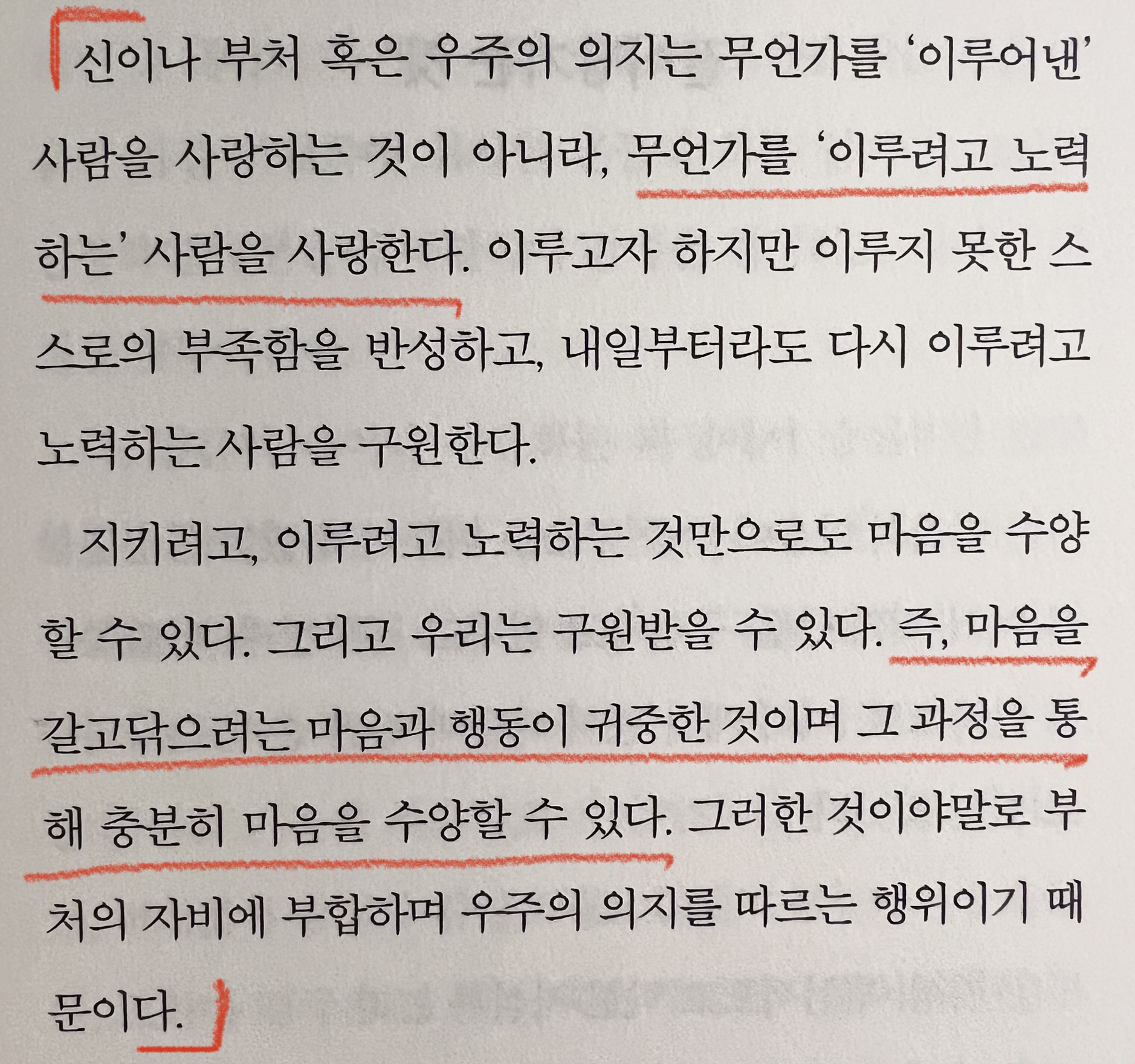 "신이나 부처 혹은 우주의 의지는 무언가를 '이루어낸' 사람을 사랑하는 것이 아니라, 무언가를 '이루려고 노력하는' 사람을 사랑한다.