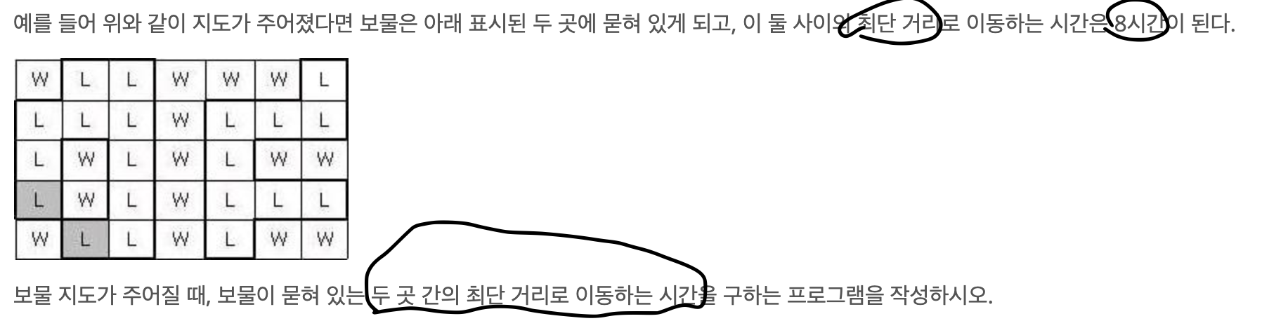 보물섬 지도를 발견한 후크 선장은 보물을 찾아나섰다. 보물섬 지도는 아래 그림과 같이 직사각형 모양이며 여러 칸으로 나뉘어져 있다. 각 칸은 육지(L)나 바다(W)로 표시되어 있다. 이 지도에서 이동은 상하좌우로 이웃한 육지로만 가능하며, 한 칸 이동하는데 한 시간이 걸린다. 보물은 서로 간에 최단 거리로 이동하는데 있어 가장 긴 시간이 걸리는 육지 두 곳에 나뉘어 묻혀있다. 육지를 나타내는 두 곳 사이를 최단 거리로 이동하려면 같은 곳을 두 번 이상 지